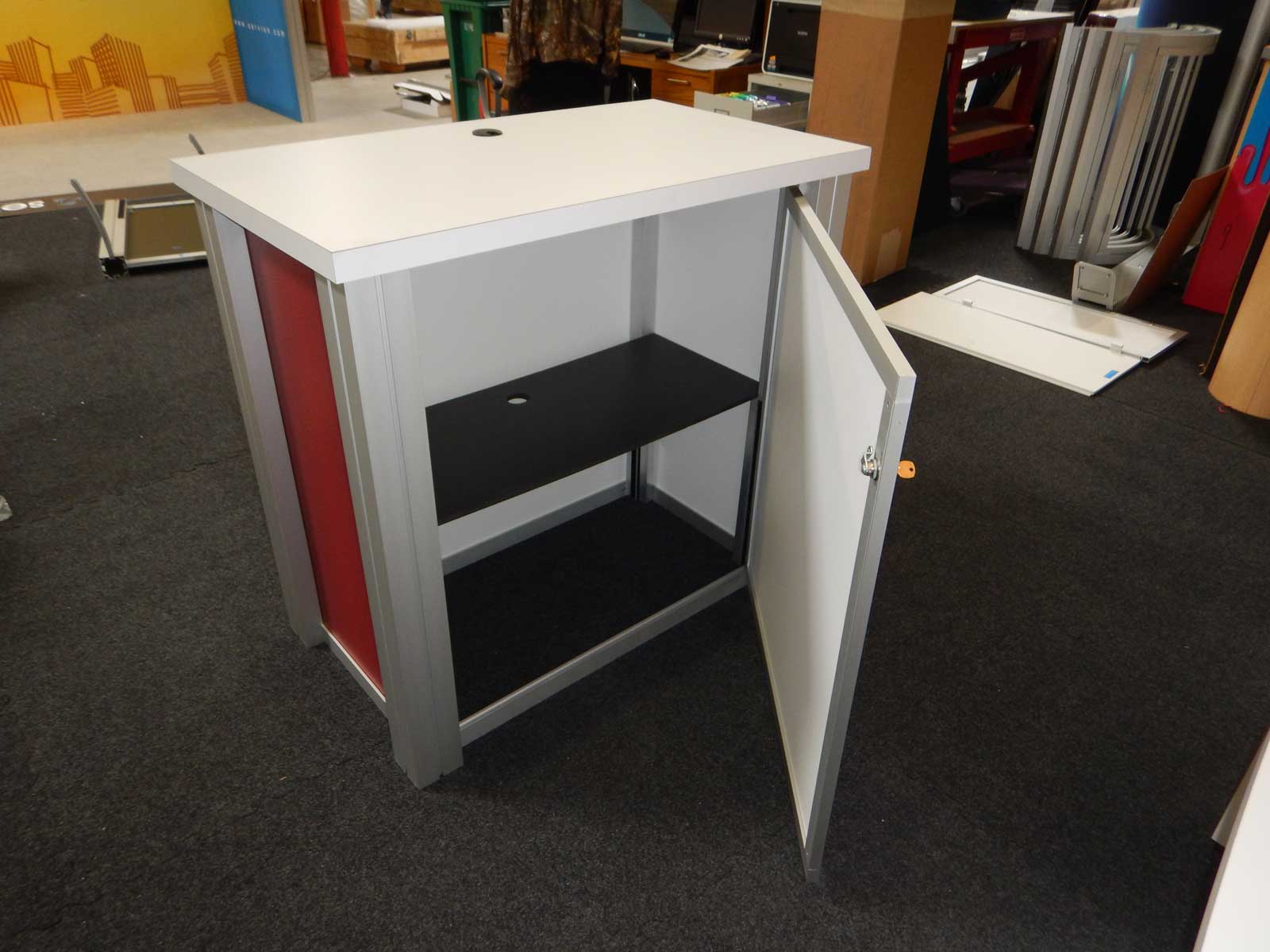 RENTAL: RE-1019 with White Laminated Ceiling Sconce with Recessed Puck Lights, White Laminated Shelves and Counter with Locking Door, Large Monitor Mount & 42" Monitor, RE-1202 Rectangular Counter with Locking Door and Internal Shelf