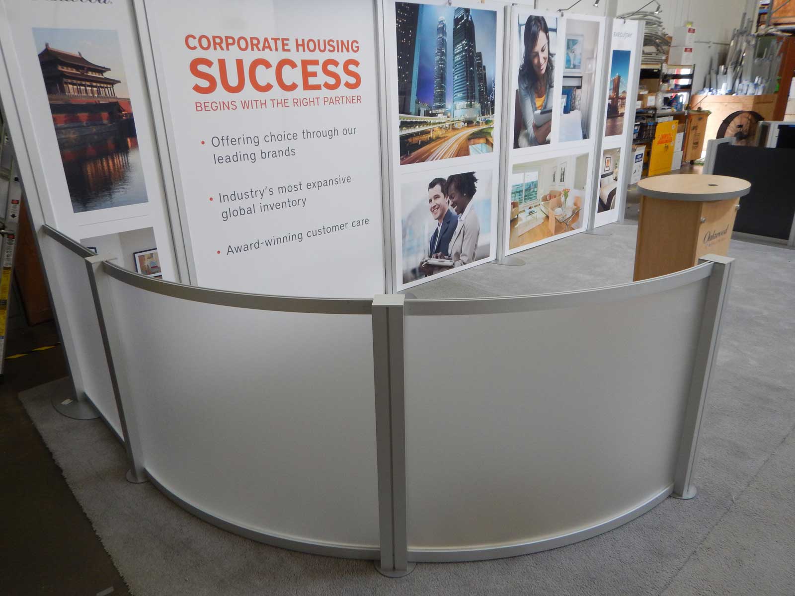 RENTAL: RE-2021 with Arch Canopy, Halogen Arm Lights, RE-1201 Reception Counter, Tension Fabric Graphics, and Sintra Header Graphic