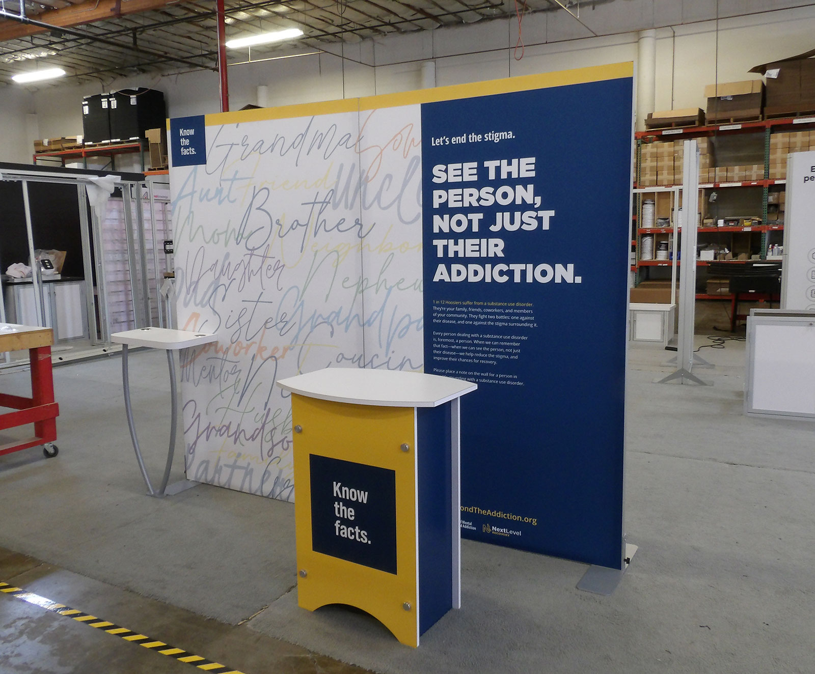 SYK-1003 Symphony Portable Display with SEG Fabric Graphic, Backwall Workstation, Wireless Charging Pads, LED Stem Lights, and SYM-406 Counter with Locking Storage SYM-406 Counter with Locking Storage