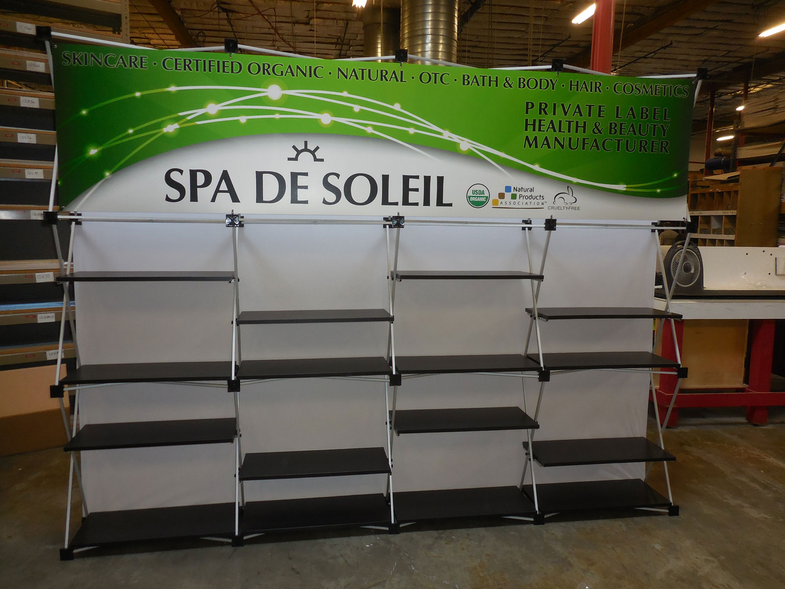 Modified FG-125 Quadro Floating Graphic Pop Up Display with Shelves and Graphics Modified FG-125 Quadro Floating Graphic Pop Up Display with Shelves and Graphics