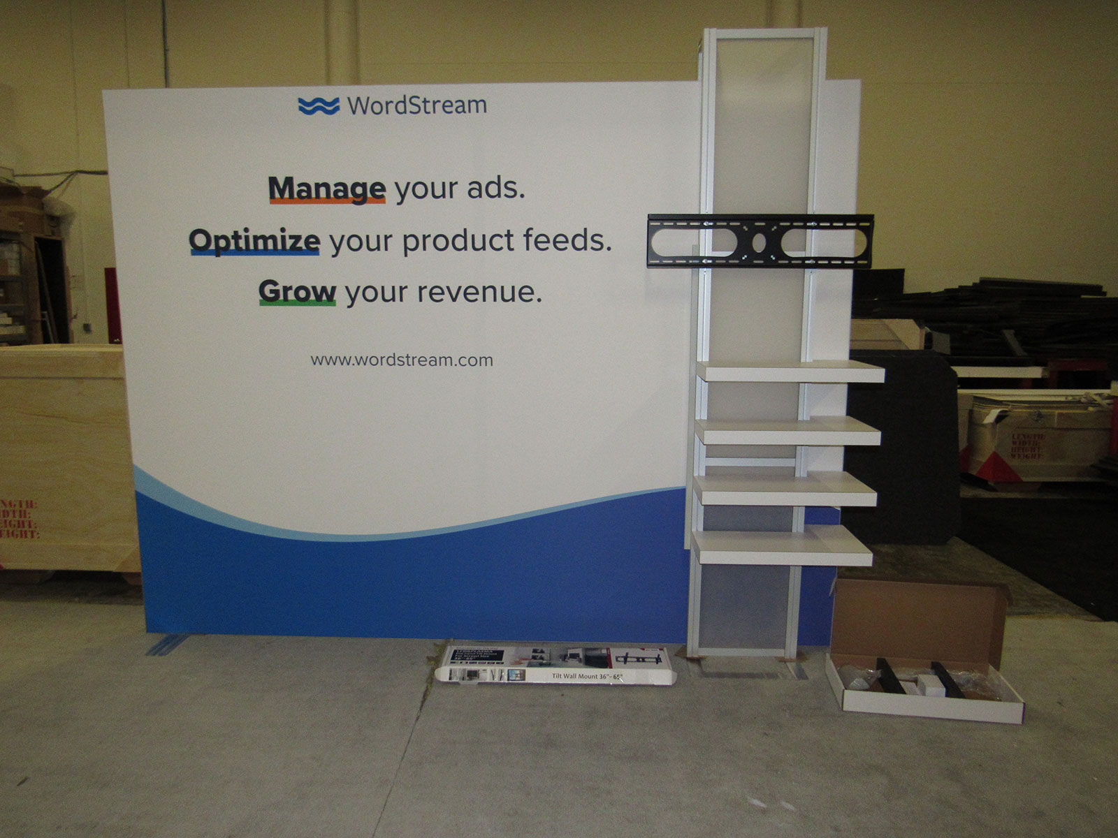 ECO-1066-A ecoSmart Sustainable Exhibit with Aluminum Extrusion Frame, FSC Wood Shelves, Fabric Graphics, and Monitor Mount ECO-1066-A ecoSmart Sustainable Exhibit with Aluminum Extrusion Frame, FSC Wood Shelves, Fabric Graphics, and Monitor Mount