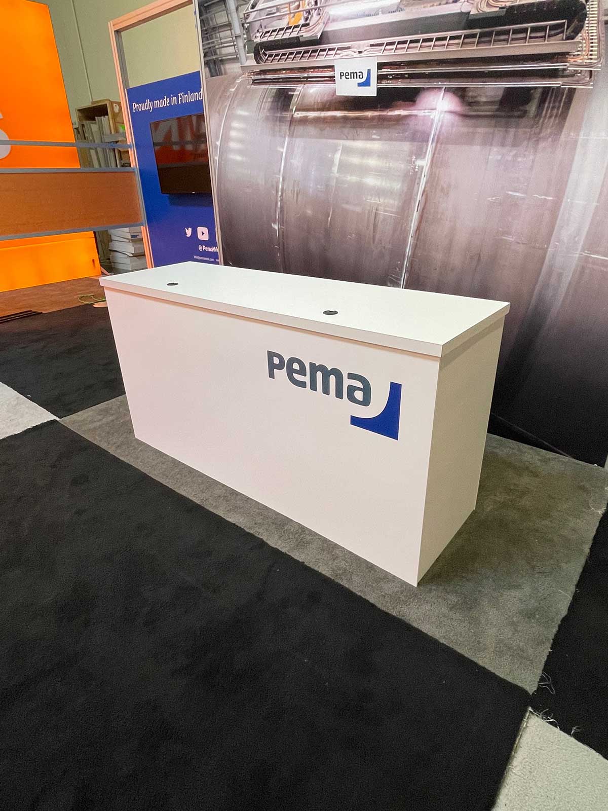 RENTAL: 30 x 40 Island Design with (2) 16 ft. High Gravitee System Towers with Locking Storage Closets, Front Extrusion Structure with Ceiling Canopy, (2) 4 x 8 Double-Sided Lightboxes, Lounge Area Structure, RE-1207 Large Rectangular Counter, (2) 55 in. Monitors, (2) 47 in. Monitors, and (1) 85 in. Monitor, (9) LED Arm Lights, SEG Fabric Graphics, and Direct Print Sintra Graphics.