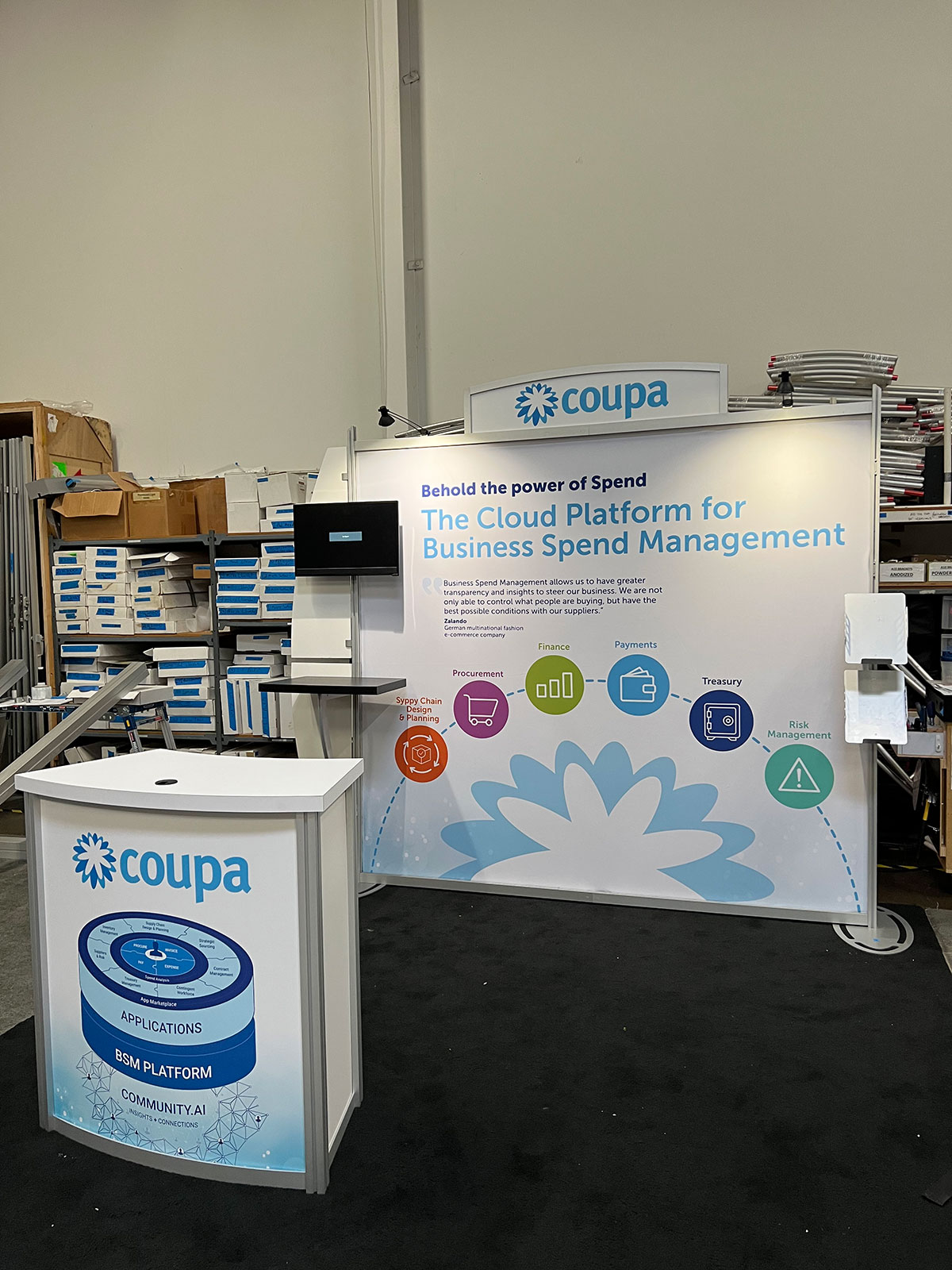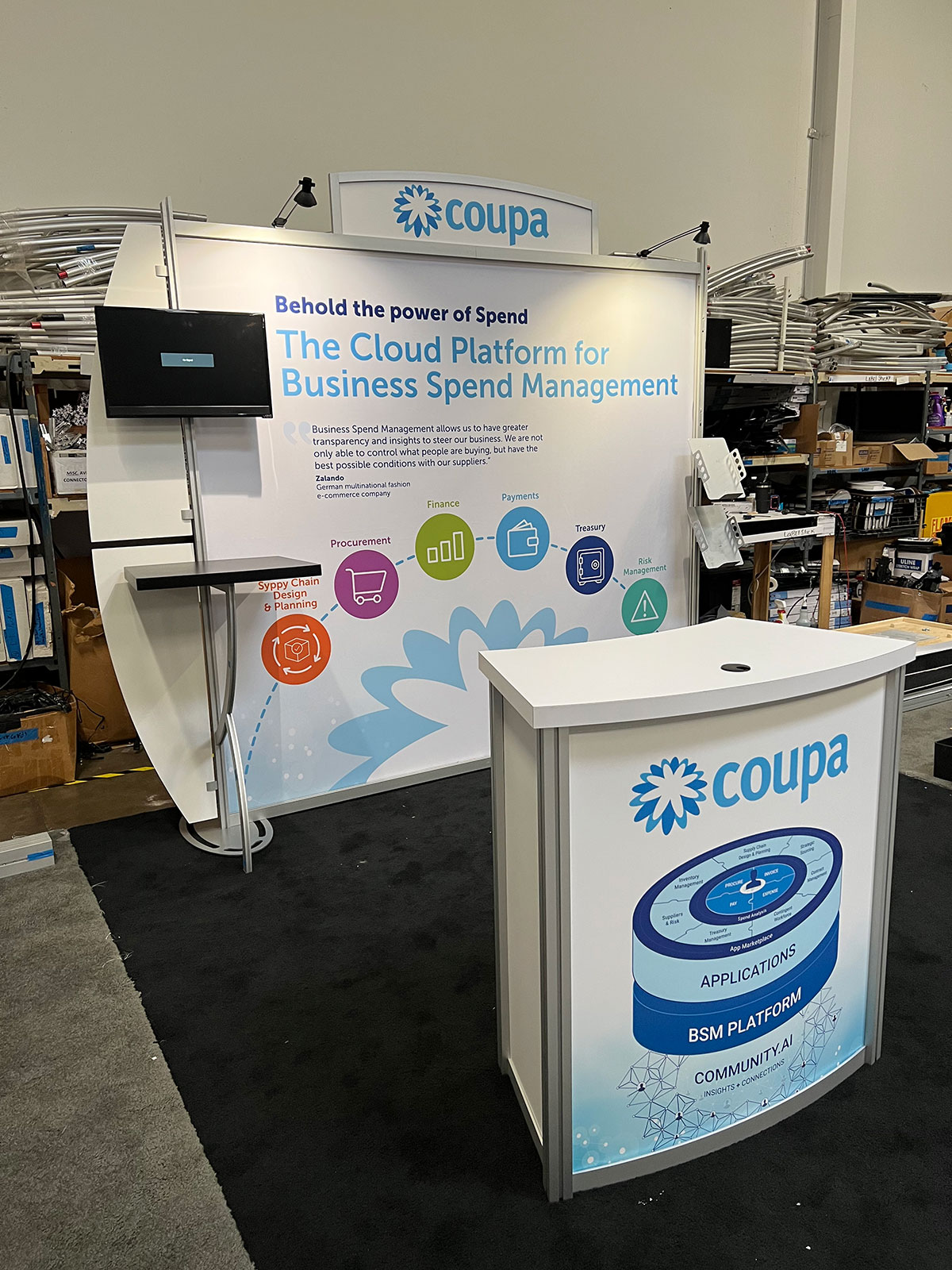 RENTAL: RE-1016 Portable Design with Arch Header, (2) LED Arm Lights, Workstation, White Sintra Accent Wings, (2) RE-170 Literature Shelves, Small Monitor Mount, Monitor, RE-1228 Small Curved Counter, Tension Fabric Graphic, and Direct Print Sintra Graphics.