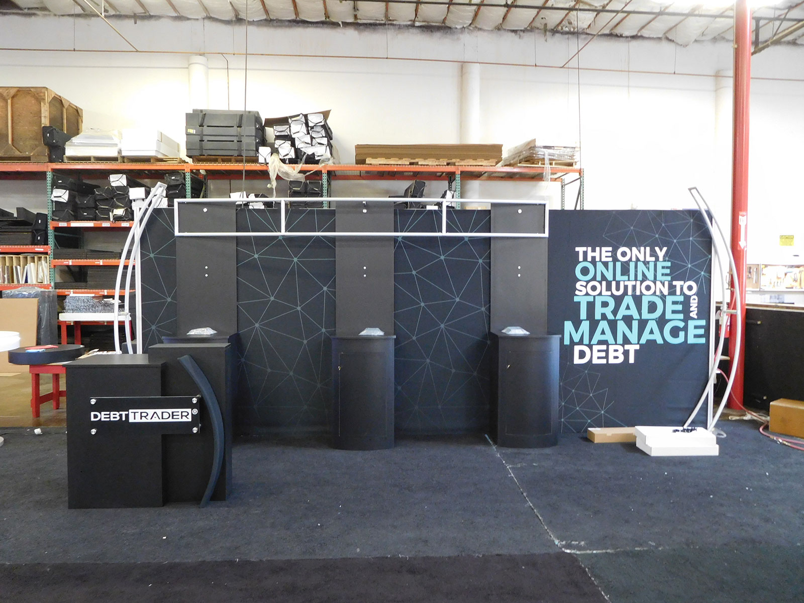 eSmart ECO-2010 and ECO-1010 Sustainable Modular Exhibit with Fabric Graphics and Header, (3) Workstations, (3) Monitor Mounts, and ECO-28C Podium [51799]