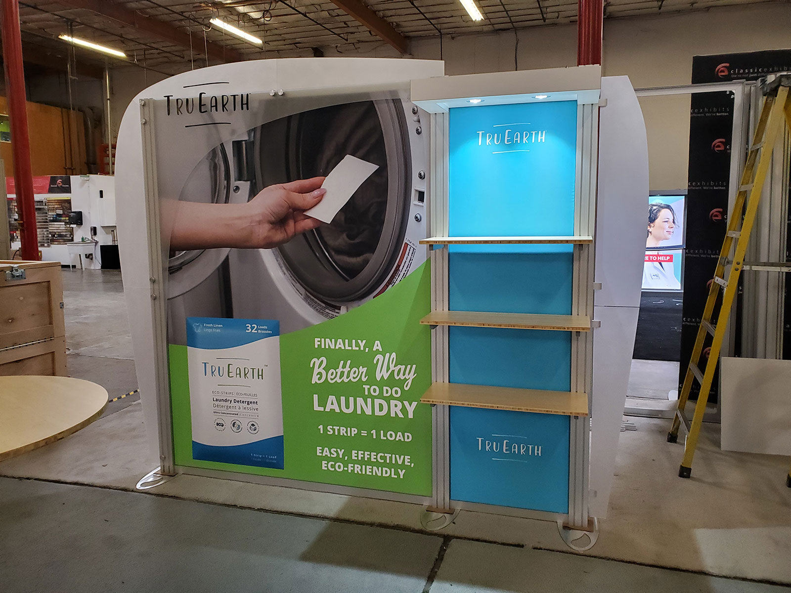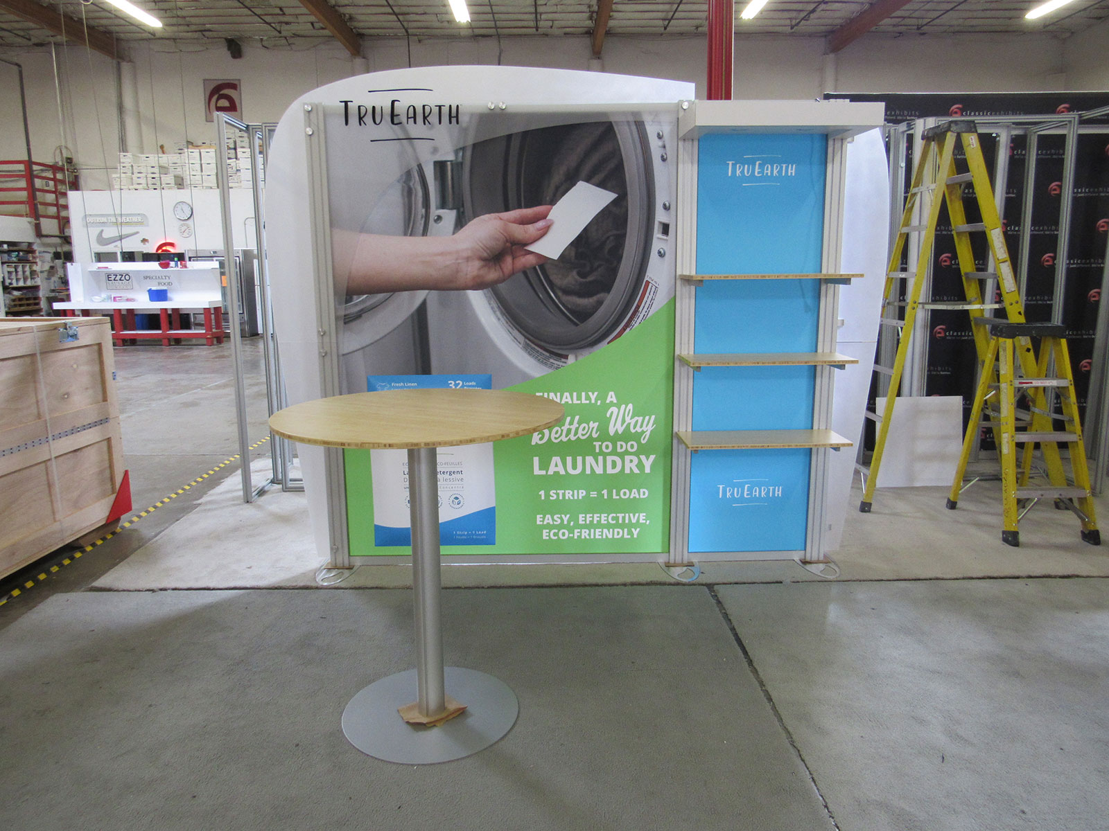 ECO-1015 Sustainable Exhibit with EcoGlass Plex Accents, SEG Fabric Graphics, Bamboo Shelves, LED Lights, and ECO-17C Table [59009]