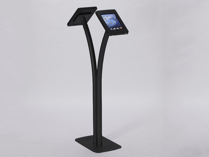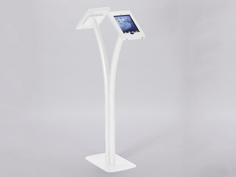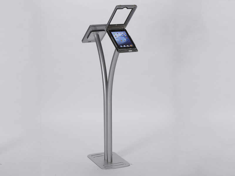 MOD-1334 Portable iPad Kiosk with GraphicsThe Port Land iPad Kiosks™ are anything but dull. They are innovative, lightweight, and affordable. The locking clamshell frame rotates with the unique Swivel Stop™ feature, allowing you to seamlessly reposition your iPad to Portrait or Landscape mode. The kiosks are made from durable engineered aluminum and assembly in minutes. There are multiple single iPad kiosks. The MOD-1334 is designed for two iPads and the MOD-1338 for four iPads. All have integrated cord management.
