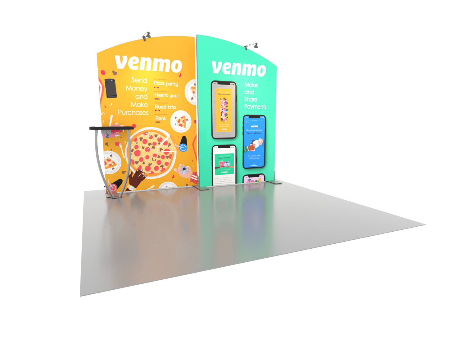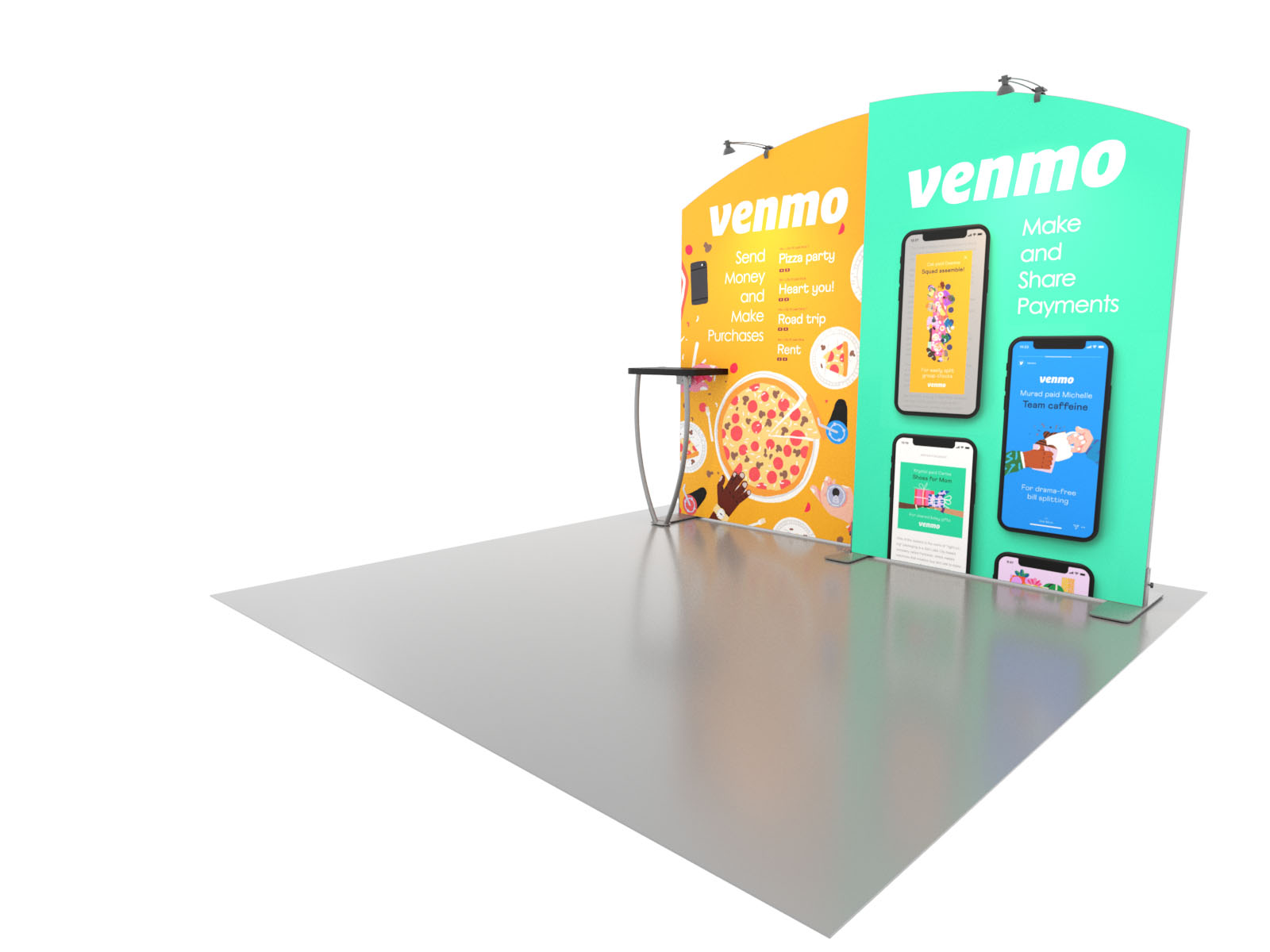Personalize your Symphony Display with attractive counters, workstations, floating graphics, iPad clamshells, and monitor mounts. The lightweight aluminum frames are engineered for SEG dye-sublimated fabric graphics for a seamless, wrinkle-free look. Add floating graphics for additional visual layering and branding.