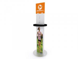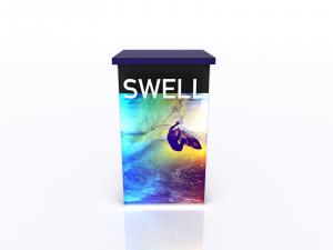 RE-2138 Trade Show Rental Exhibit -- Image 2In addition, the RE-2136 and 2138 inlines have bistro height charging tables with programmable RGB LED accents lights. The accent lights can be “dialed” to match the dominant color pattern of the graphics, a nice custom touch in a rental display. All three assemble quickly with mostly tool-less connections, and the backlit LED lights are attached to the frames.