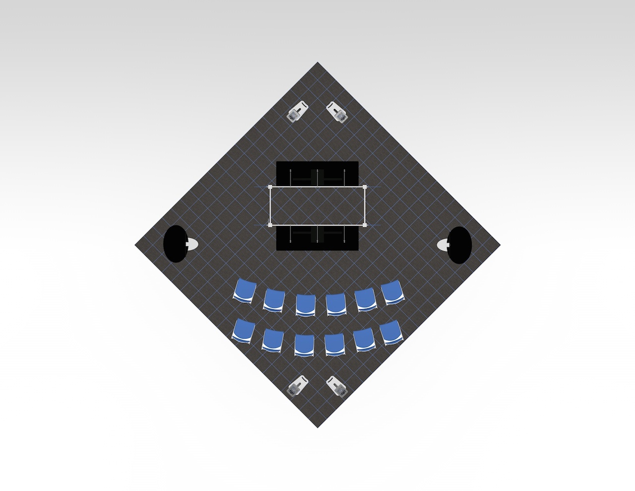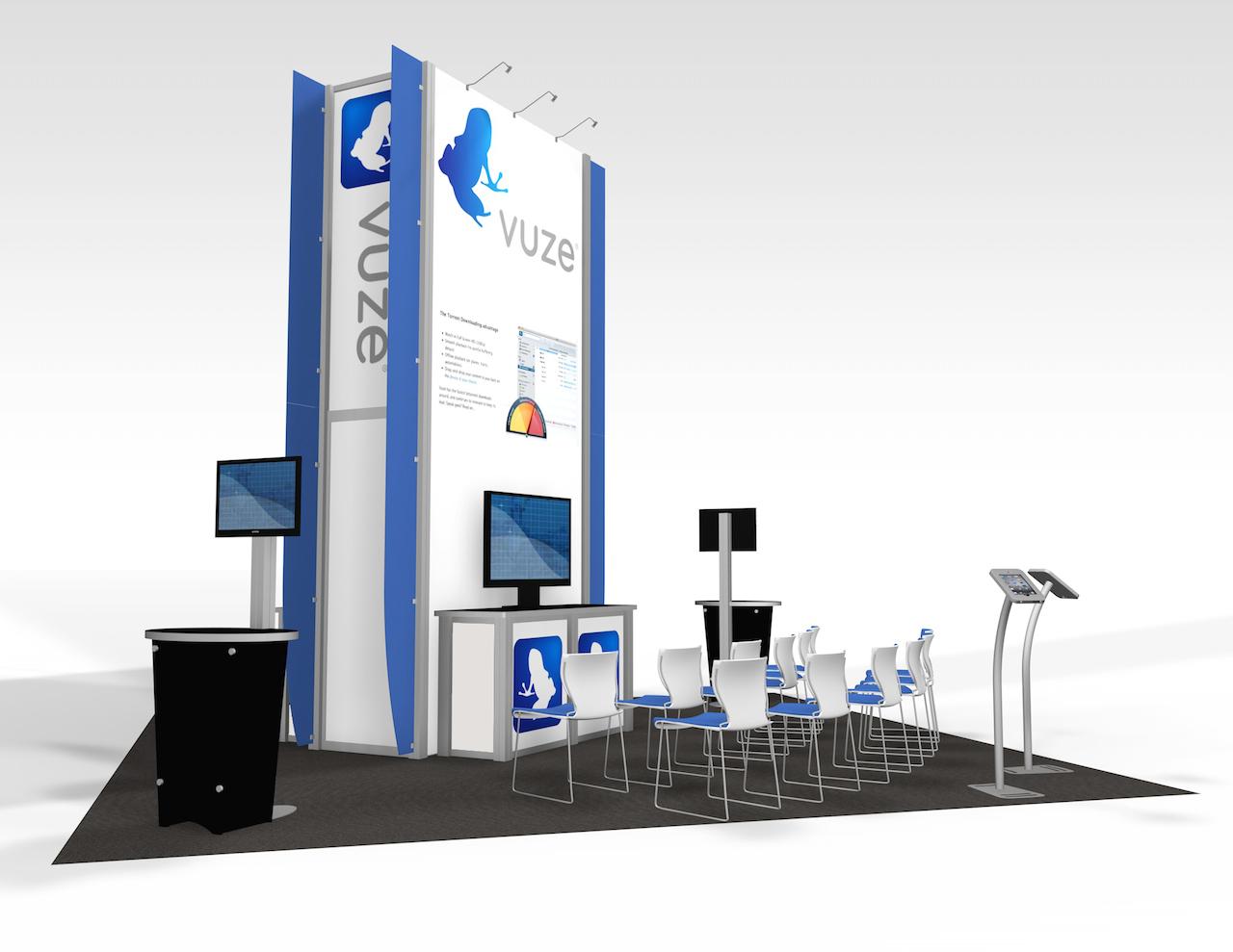 The Rental Island Exhibits go way beyond a pretty picture. We've incorporated key features such as large graphics, private and semi-private conference rooms, towers with locking storage access, and workstations and reception counters with secure storage. Not enough? Then add product shelves, large and small monitors for presentations, a variety of light fixtures, and hanging signs for high visibility from anywhere on the show floor. We also offer three contemporary double-deck configurations.