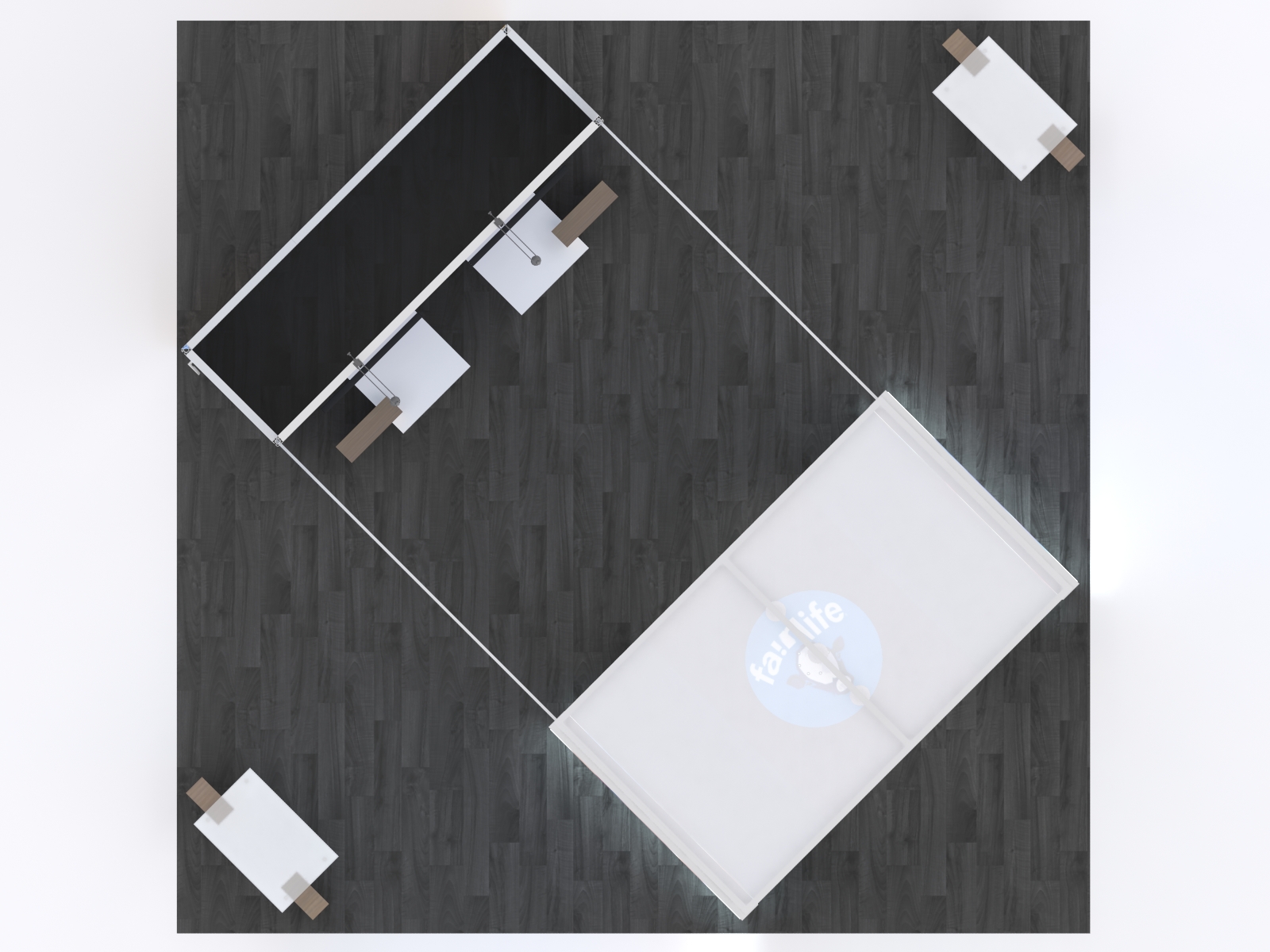 An Island Exhibit should attract attention. The VK-5147 and VK-5148 are designed for maximum exposure at your next show. It all starts with two 12 ft. double-sided SuperNova Lightboxes on either side of a casual meeting space. The meeting space includes a MOD-1430 Charging Station with LED perimeter lights and (8) USB ports. On the aisle, there are small custom reception counters with storage. Beneath the monitors are attractive workstation counters. No island would be complete without closet storage for products, giveaways, coats and briefcases, and cleaning supplies. Anchoring each island design is a 16 ft. double-sided tower with fabric graphics and downlighting.