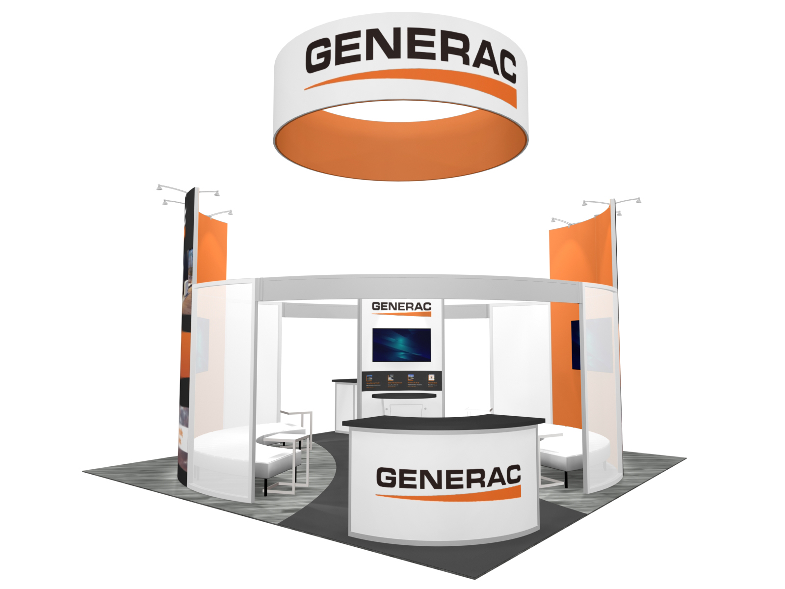 Put simply, Occam's Razor states: “The simplest solution is almost always the best.” The RE-9163 Island manages to be both beautiful and welcoming while maximizing the 20 x 20 floor space. It features multiple large format graphics and an overhead hanging sign to draw attention from across the show hall. There are several open entrances along with a contemporary curved reception counter (with branding). The two counter/kiosks stations are perfect for sales presentations, and the large comfortable lounge and charging table makes it easy and convenient to relax with clients. it's simple, straightforward, and inviting.