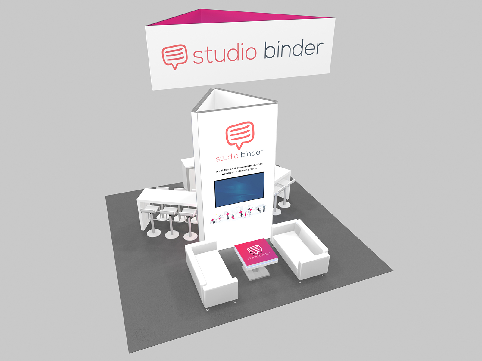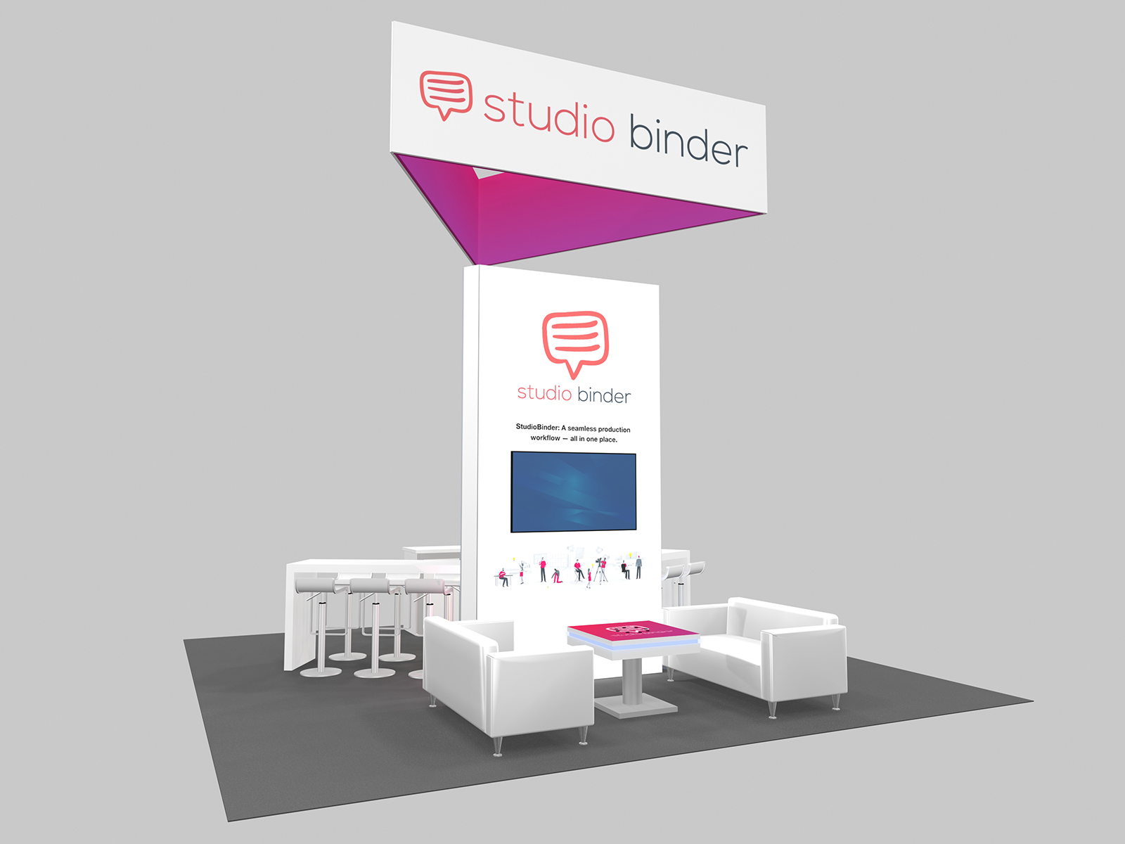 Each design emphasizes a unique strategy. The RE-9187 has a larger 16 ft. tower for greater visibility along with double-side monitor kiosks and genius bars with chairs to meet with clients. The RE-9188 exchanges the 16 ft. tower for a 12 ft. tower and triangle hanging sign. And like the RE-9187, there's a reception counter with locking storage. The RE-9189 maximizes the available 20 x 20 floor space with multiple 12 ft. triangle towers, casual meeting spaces, a larger reception counter, and a square hanging sign.