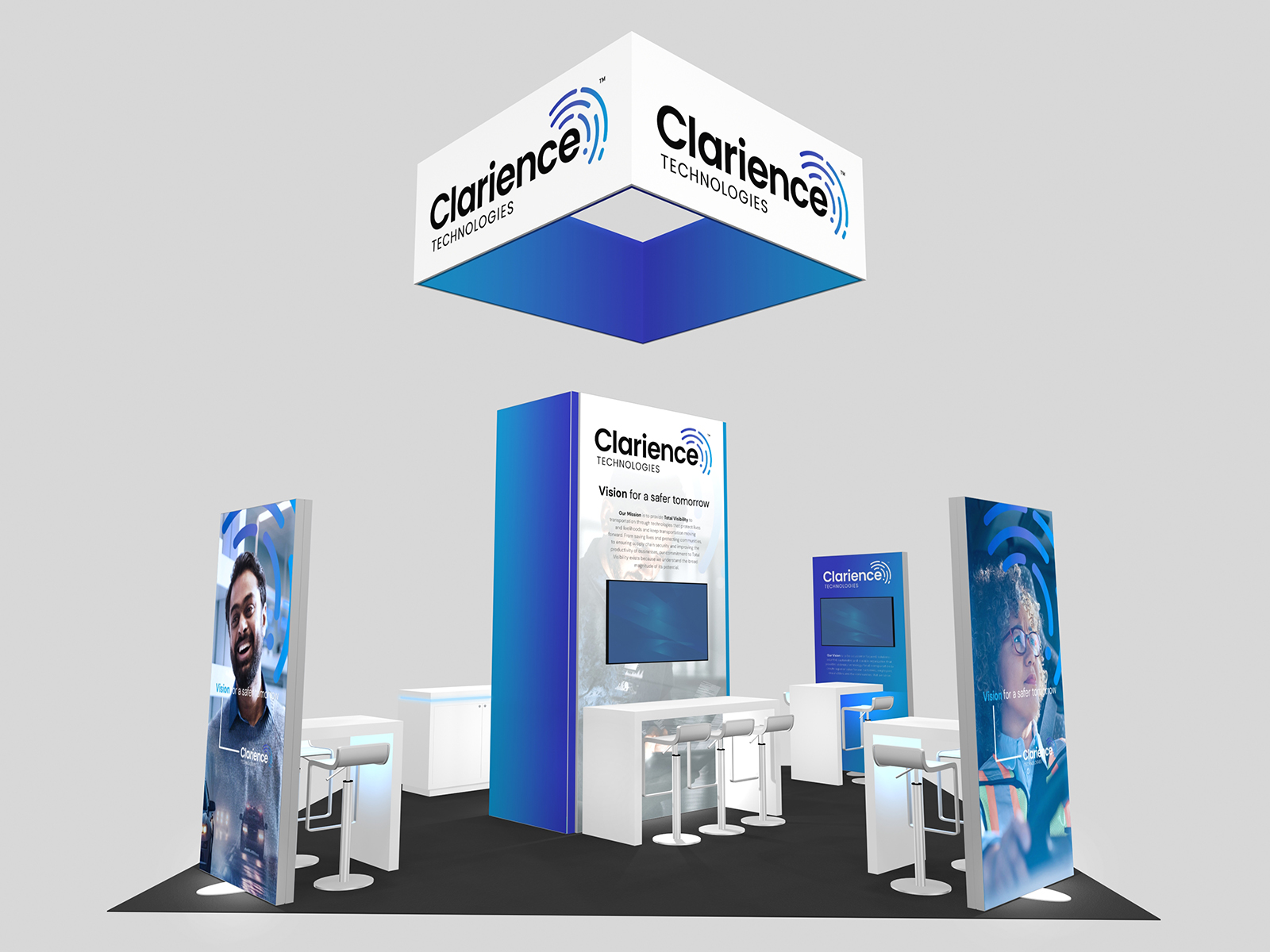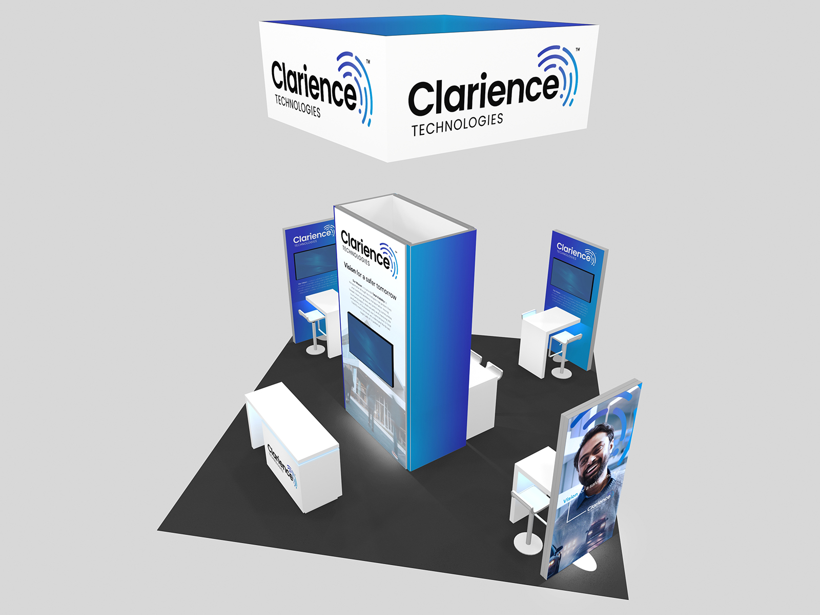Surrounding the tower are individual workstations, each with a monitor, waterfall counter, and chairs. The workstations are connected to double-sided lightboxes which offer some privacy while highlighting the company's overall branding and messaging. For added visibility in the exhibit hall, the RE-9190 and 9192 include an overhead hanging sign position above the tower.