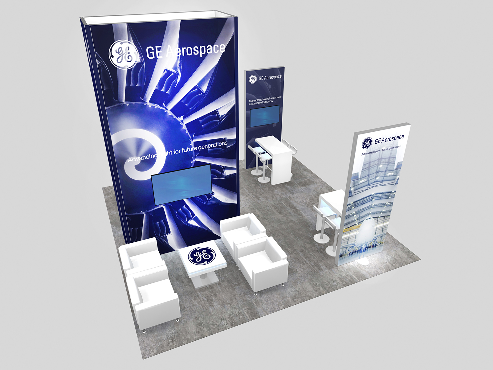 Surrounding the tower are individual workstations, each with a monitor, waterfall counter, and chairs. The workstations are connected to double-sided lightboxes which offer some privacy while highlighting the company's overall branding and messaging. For added visibility in the exhibit hall, the RE-9190 and 9192 include an overhead hanging sign position above the tower.