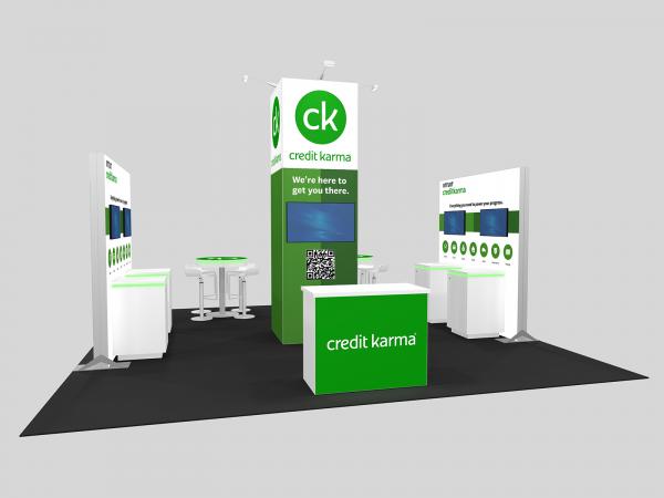 The RE-9203, 9204, and 9205 series show three cost-effective rental designs with towers, counters, backlit graphics and casual seating areas. The RE-9203 starts with a smaller footprint tower which opens up the 20 x 20 space for two product demos stations with backlit graphics and two bistro charging tables. The RE-9204 has a soaring 190” tower surrounded by double-sided monitor kiosks and a semi-private conference room area. Finally, the RE-9205 showcases a 16 ft. tower, a walk-in closet, reception counter, and (2) charging tables with LED accent lights.