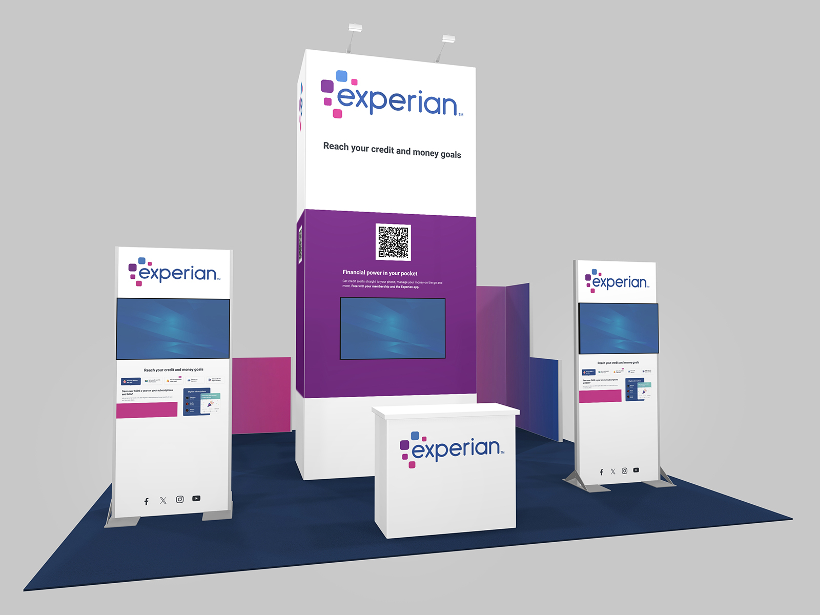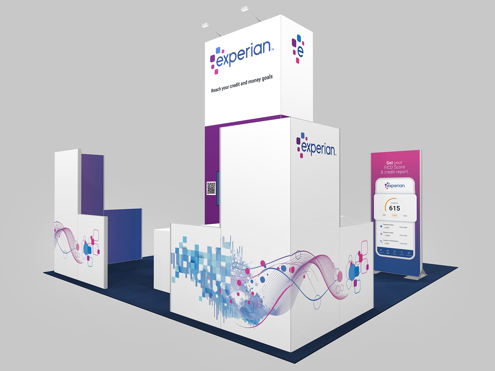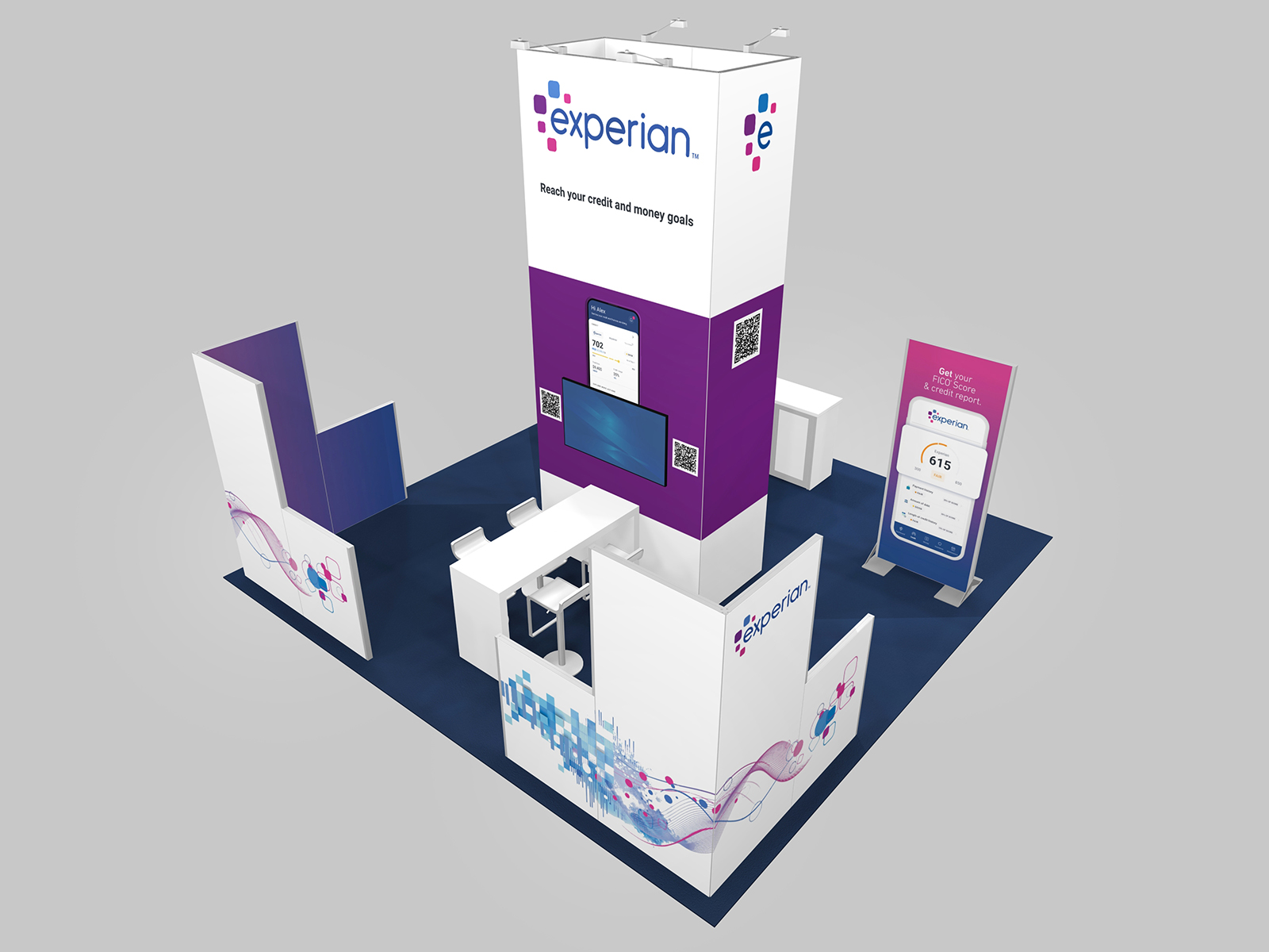 RE-9204 Island Rental Trade Show Exhibit -- Image 2The RE-9203, 9204, and 9205 series show three cost-effective rental designs with towers, counters, backlit graphics and casual seating areas. The RE-9203 starts with a smaller footprint tower which opens up the 20 x 20 space for two product demos stations with backlit graphics and two bistro charging tables. The RE-9204 has a soaring 190” tower surrounded by double-sided monitor kiosks and a semi-private conference room area. Finally, the RE-9205 showcases a 16 ft. tower, a walk-in closet, reception counter, and (2) charging tables with LED accent lights.