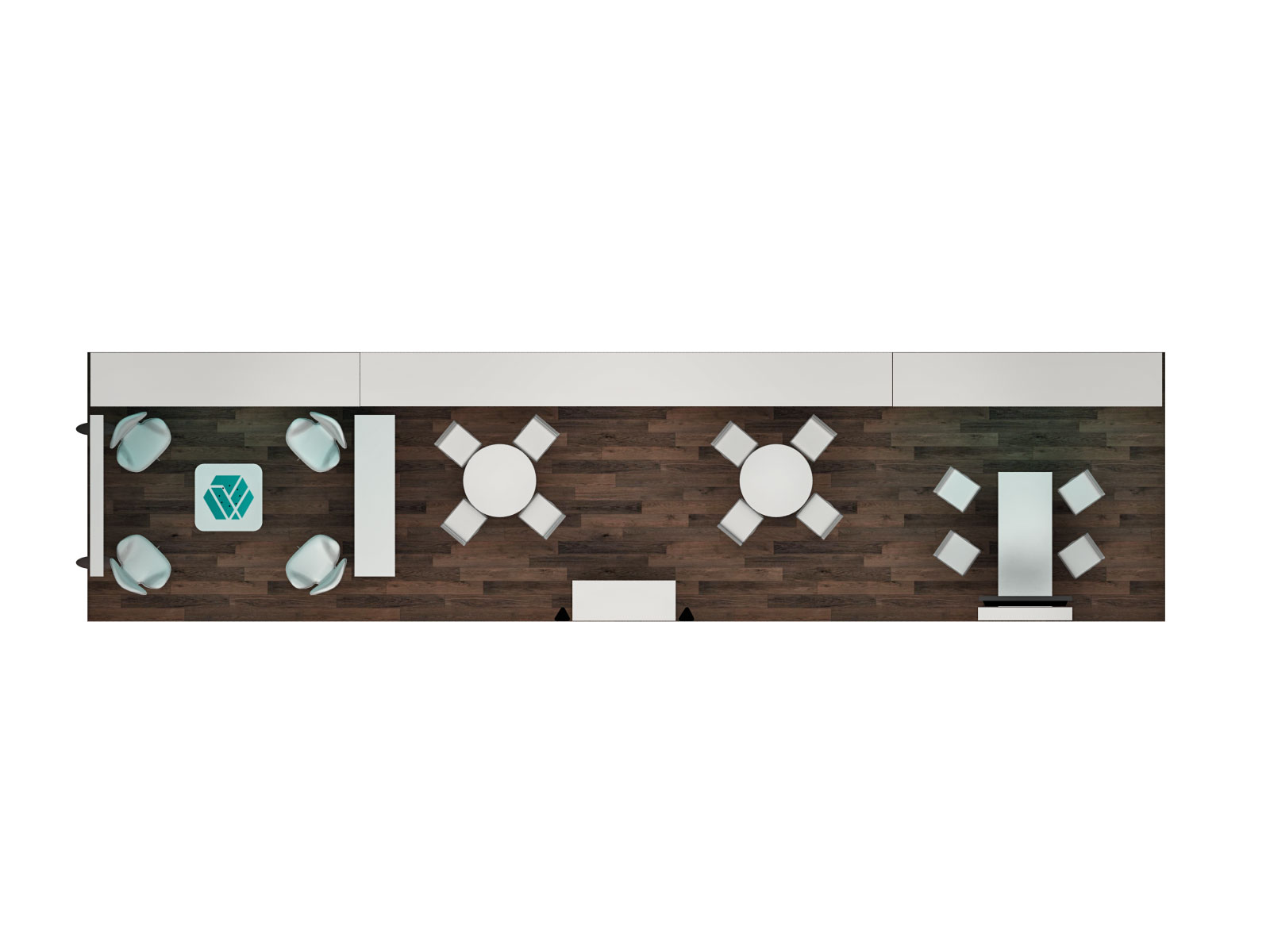 Clean, dynamic, inviting, and practical. The VK-4001, VK-2985, and VK-1340 custom modular series strikes the ideal balance of large backlit graphics, video/monitor(s), and casual seating, all in well-defined spaces. It allows for multiple meetings using monitors either as presentation devices or information videos. The large backlit fabric graphics create a seamless visual presentation whether in the 10, 20, or 40 ft. inline configurations. The individual sections work as modules, allowing to grow or adapt to their changing trade show schedule. In addition there's ample locking storage and optional charging stations built into the counters and tables.