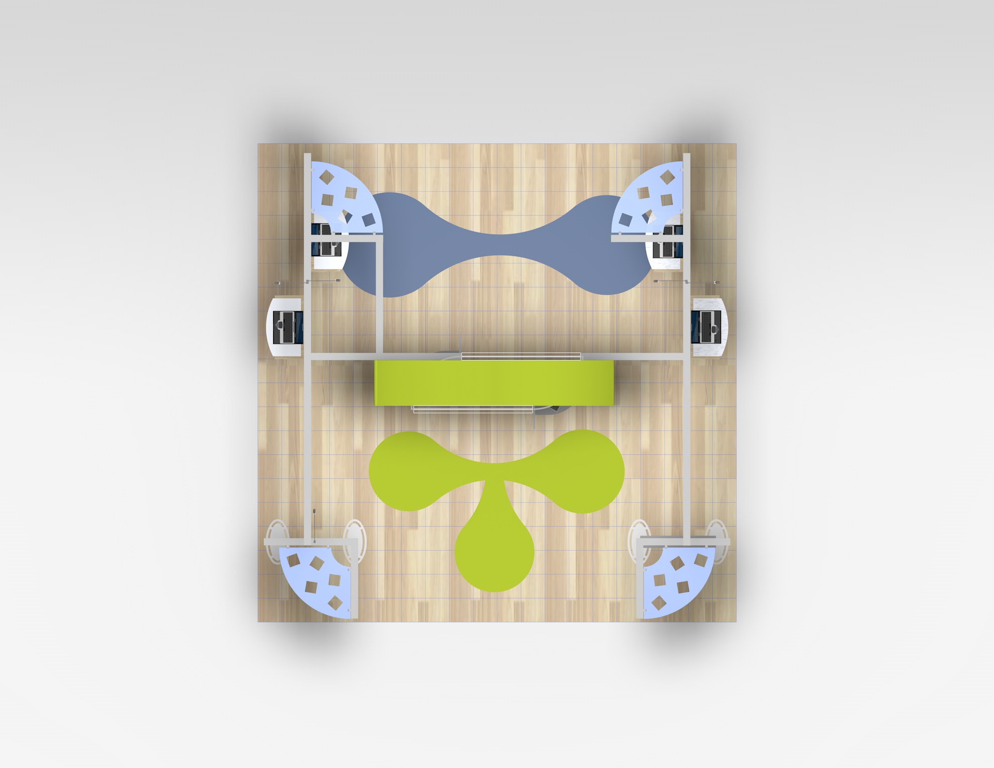 The four outlying structures present additional branding space, with two serving as workstation areas and the large monitors mounted to the remaining two structures. Additional architectural elements featured in the VK-5077 are extrusion caps color-matched to the tower canopy and (customizable) perforated acrylic accents mounted above each outlying structure.