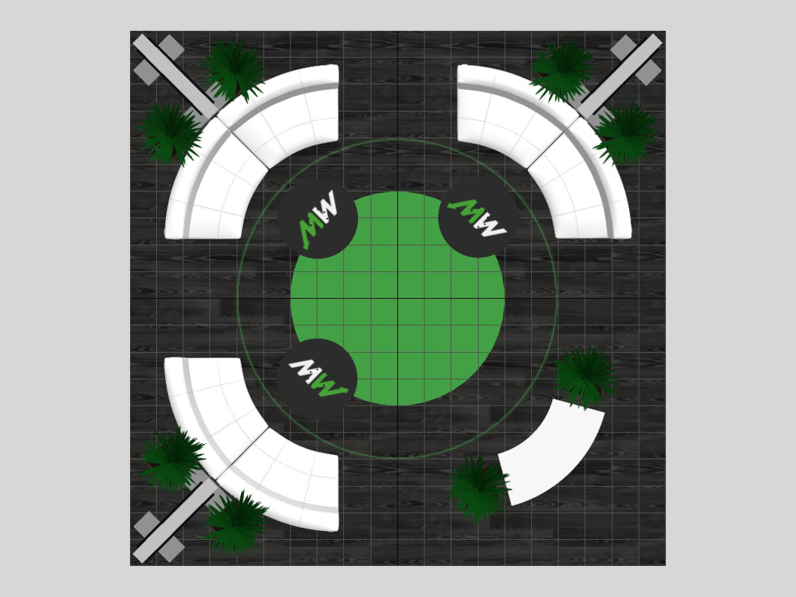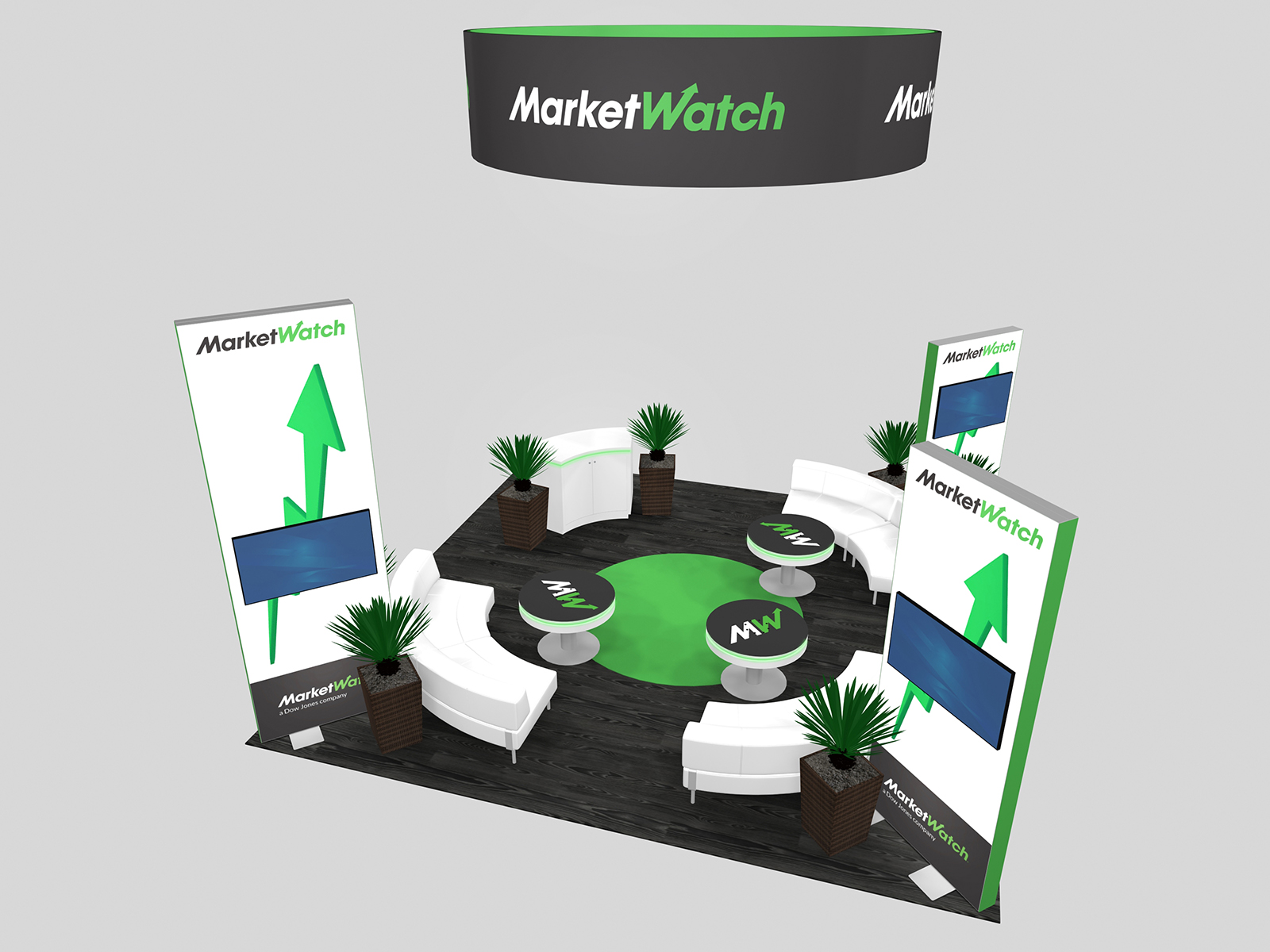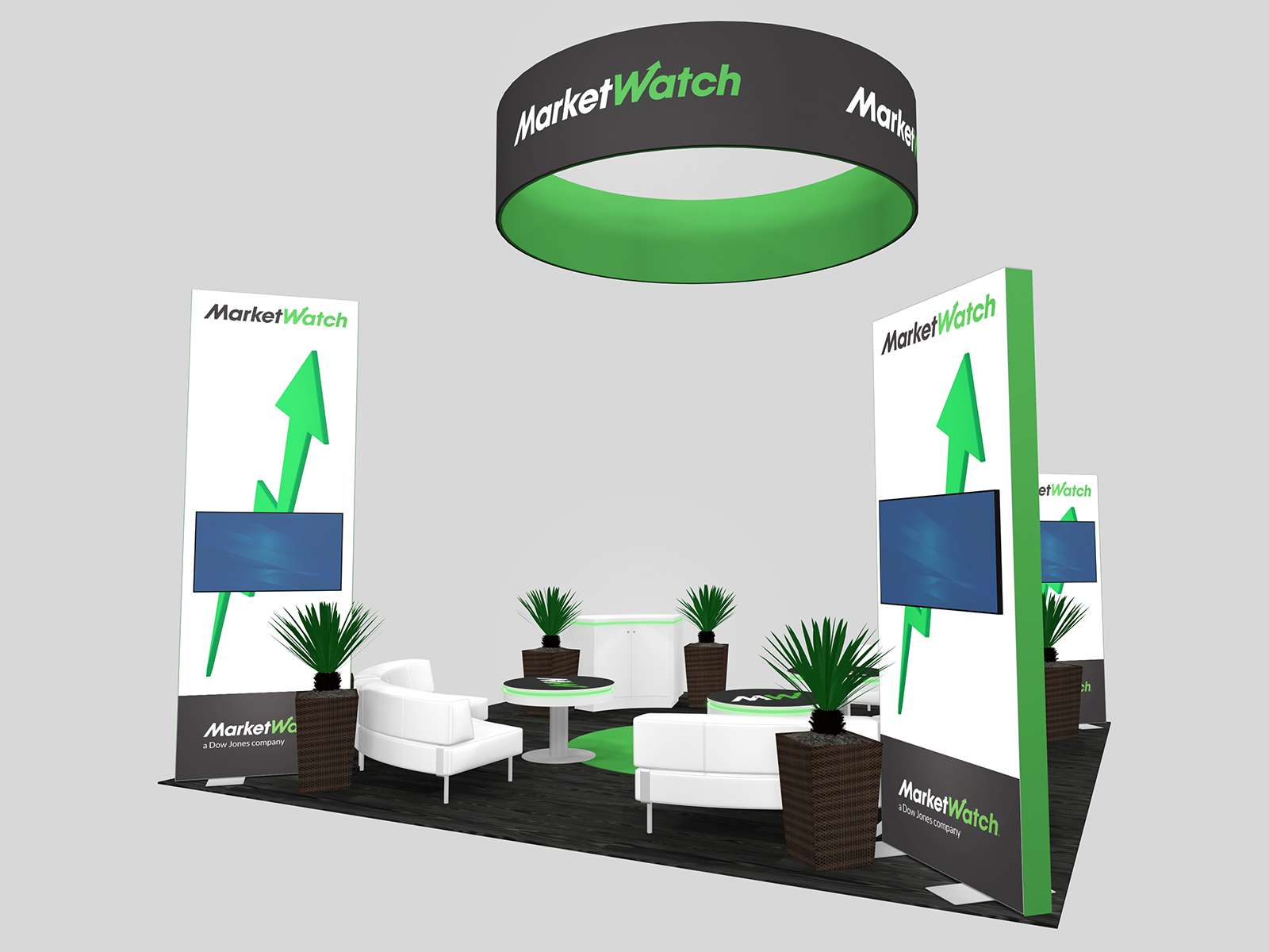 The VK-5202 places video towers on the corners and the open floorplan invites traffic into the extensive seating area with curved sofas and charging tables. The hanging sign attracts attention throughout the show hall while centering the seating area in the island.